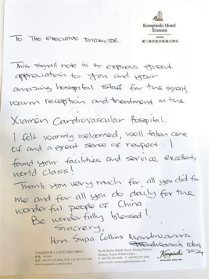 诊疗结束后,苏帕·柯林斯·曼迪万吉拉对厦心医院的服务水平、医疗技术和管理水准之高赞叹不已,并当场手写了一封感谢信。他在信中表示,自己在厦心医院感受到了世界级的设施和服务水平,对厦门为国际友人提供的高水平的医疗服务表示感谢。
