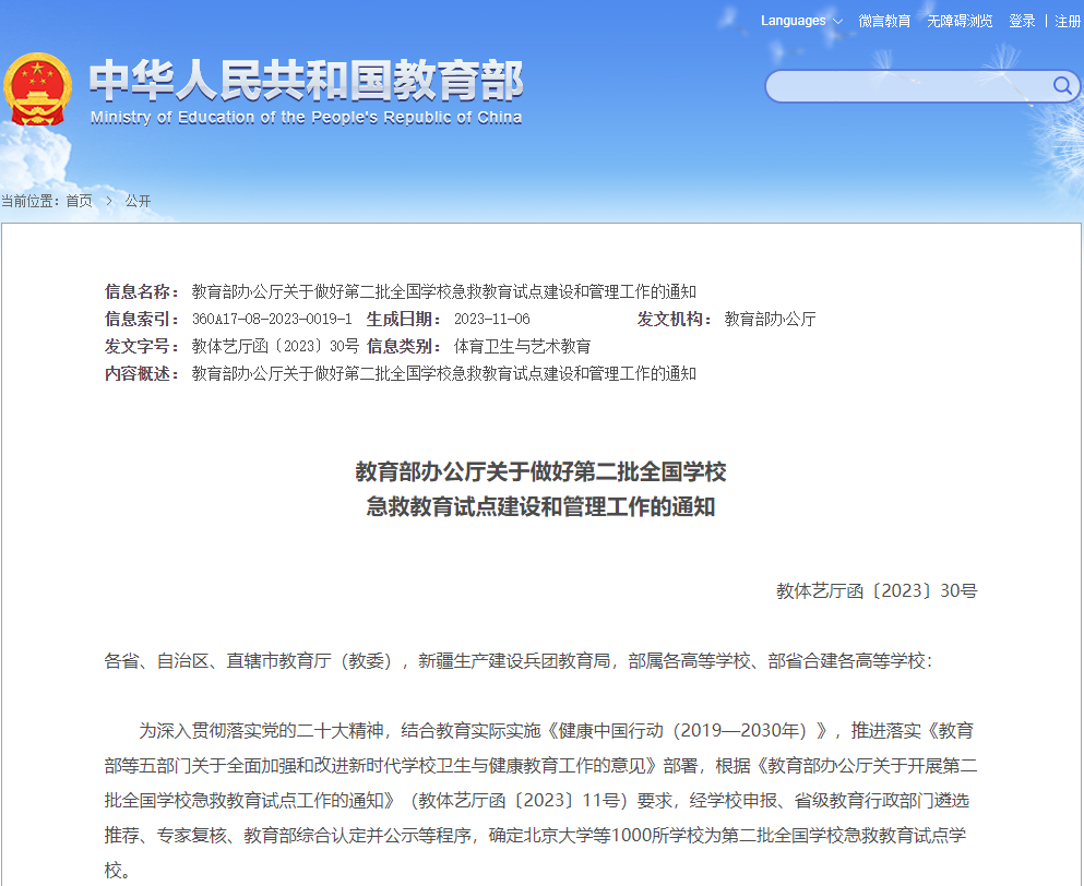 11月3日,教育部办公厅发布《教育部办公厅关于做好第二批全国学校急救教育试点建设和管理工作的通知》,确定1000所学校为第二批全国学校急救教育试点学校,建设周期为2年。其中,福建30所、厦门3所学校入选,我校位列其中。