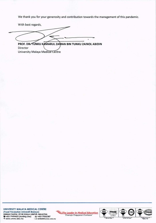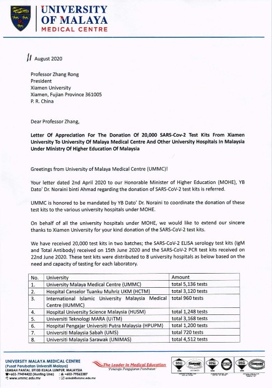近日,马来亚大学医学中心致函我校,感谢我校向马方抗击新冠肺炎疫情捐赠第二批医疗物资。该批物资包含IgM抗体检测试剂1,700份、总抗体检测试剂(酶联免疫法)16,500份和核酸检测试剂1,800份,该批检测试剂均为我校自主研发。今年4月初,我校向马来西亚高教部捐赠了第一批物资,包含5万个普通医用口罩、2,000个N95医用口罩、500套医用防护服及200套医用护目镜。马高教部部长诺莱妮曾致函我校表示感谢。