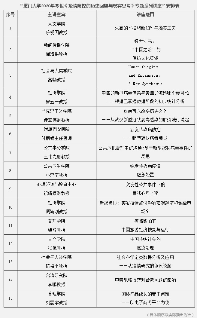 受新型冠状病毒感染肺炎疫情影响,我校新学期开学时间将延后。如何正确看待这次疫情?如何“停课不停学”?学校积极组织专家学者,从2月5日开始,陆续推出厦门大学2020年寒假《疫情防控的历史回望与现实思考》专题系列讲座,从疫情防控的历史与现实、疫情与经济运行、疫情与社会秩序及社会心态、疫情与公共治理以及疫情与人类生活等角度引导师生理性看待疫情,增强对人与自然、人与社会、人与历史关系的理解和把握。