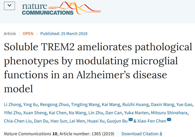 月25日,厦门大学神经科学研究所暨福建省神经退行性疾病及衰老研究重点实验室陈小芬教授课题组与美国Mayo clinic卜国军教授等单位合作,在阿尔茨海默病的发病机制与靶向治疗研究上取得重要突破,相关成果“Soluble TREM2 ameliorates pathological phenotypes by modulating microglial functions in an Alzheimer’s disease model”发表于《Nature Communications》上(Nat. Commun. 2019, DOI: 10.1038/s41467-019-09118-9)。