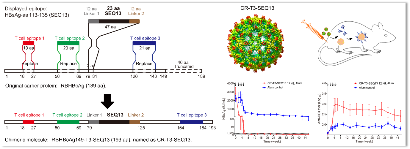 夏宁邵教授团队在前期研究获得了大量针对乙肝表面抗原的抗体,通过功能抗体靶向筛选技术,确定了识别非免疫优势sA表位(B细胞表位)的E6F6抗体在动物体内具有持久有效的乙肝表面抗原清除功能(Gut,2016),提示sA表位可能成为乙肝治疗性疫苗的新靶标,申请的相关核心发明专利已获美国、日本、加拿大、澳大利亚和韩国授权。有鉴于此,该团队提出构建B细胞表位嵌合型类病毒颗粒疫苗的设想,期望该疫苗能在机体中诱导具有治疗功能的抗体应答。