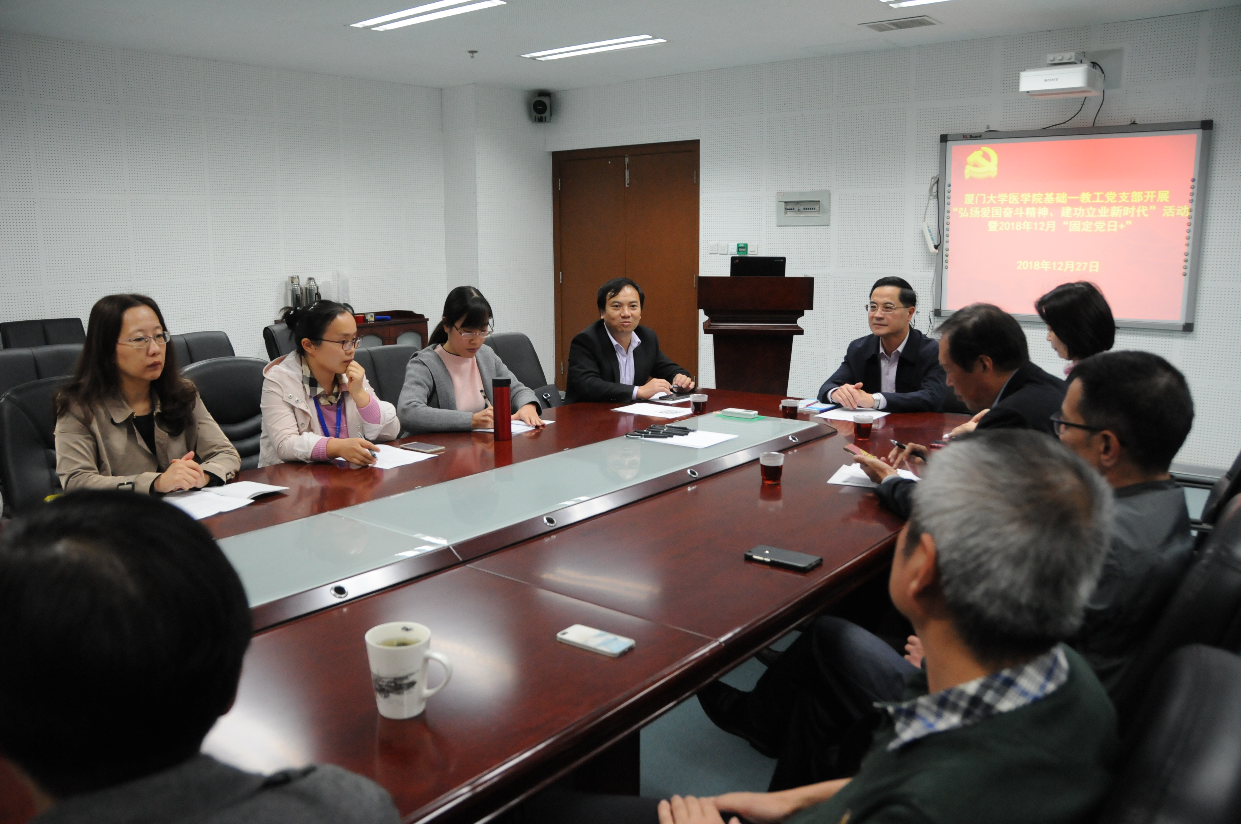 12月27日下午,邱伟杰副校长深入他所联系的医学院基础部教工一支部“固定党日+”活动。活动以“弘扬爱国奋斗精神、建功立业新时代”主题,组织党员结合学习习近平总书记在庆祝改革开放40周年大会上的讲话精神,畅谈如何坚持党的领导,弘扬爱国奋斗精神,为“双一流”建设贡献力量。