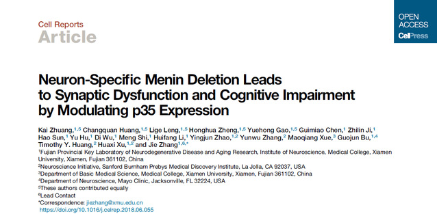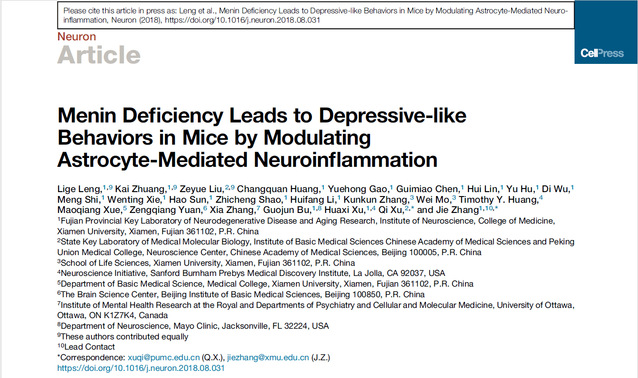 9月13日,《Cell》旗下杂志、神经科学顶级期刊《Neuron》(IF:14.32)在线发表了厦门大学医学院、神经科学研究所张杰教授团队的最新研究成果,发现了抑郁症新的致病基因MEN1,并阐明了MEN1调控星形胶质细胞炎症导致抑郁发生发展的新机制,为抑郁症的诊治提供了新靶点和方向。论文链接:https://www.cell.com/neuron/fulltext/S0896-6273(18)30736-0