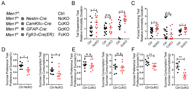 张杰教授团队发现,在慢性不可预测以及LPS处理的模拟抑郁小鼠模型中,多发性内分泌肿瘤蛋白(menin)在大脑中的表达显著降低,并且在星形胶质细胞中降低最明显。为了研究menin是否参与了小鼠抑郁表型的产生,研究团队制作了多种神经系统menin条件性敲除小鼠。通过对这些小鼠行为学的检测,锁定了只有在星形胶质细胞中敲除menin后,小鼠才会表现出抑郁样表型。证实了menin可能是通过调控星形胶质细胞的功能促进了抑郁的发生,如下图: