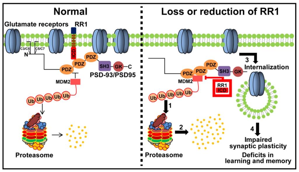 RPS23RG1是团队鉴定出的一个新基因蛋白,在前期研究中发现该基因及其家族的过表达可以同时抑制在AD致病过程中起重要作用的Aβ产生和tau蛋白磷酸化,工作先后发表在Neuron、Human Molecular Genetics等高水平杂志。在这项最新研究中,团队又发现RPS23RG1 (RR1)可以通过影响神经突触后膜蛋白PSD-93和PSD-95与泛素连接酶MDM2的结合,调节PSD-93/PSD-95的泛素化及蛋白酶体降解,进而调控神经突触的结构与功能(如图所示)。Rps23rg1基因敲除小鼠表现出神经突触结构功能以及认知记忆的损害。更重要的是,RPS23RG1的水平在AD患者和AD模型小鼠中下降,而RPS23RG1的衍生多肽不仅可以缓解Rps23rg1敲除小鼠的神经突触损害和认知功能障碍,还可以缓解AD模型小鼠的疾病症状。这些结果揭示了RPS23RG1在神经突触功能调节中的重要作用、以及其水平发生异常时导致AD疾病发生发展的机制。目前对于AD还缺乏有效的治疗药物,针对Aβ和tau的临床实验也纷纷失败,迫切需要寻找新的AD治疗靶标。因此,团队的这项工作不仅为阐释AD的疾病过程提供了新的理论,而且为AD的治疗提供了新的靶点和潜在药物,具有重要的理论和应用意义。