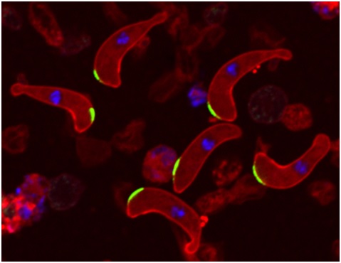 图. 疟原虫GCβ蛋白在成熟动合子(新月形)顶体突出一侧聚集