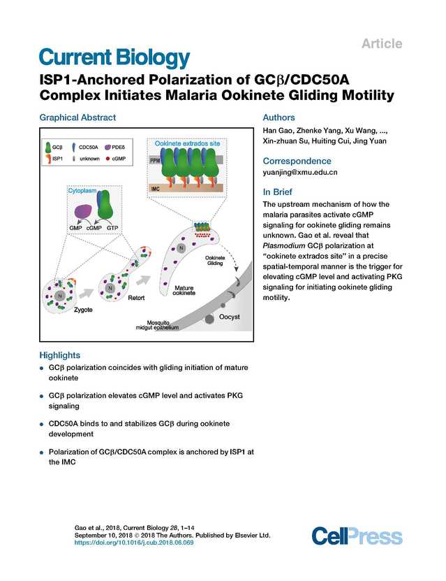 8月24日,《Cell》子刊《Current Biology》在线发表了厦门大学生命科学学院袁晶教授题为“ISP1-Anchored Polarization of GCβ/CDC50A Complex Initiates Malaria Ookinete Gliding Motility”的研究论文。该工作揭示了疟疾病原疟原虫通过媒介按蚊传播过程中的关键步骤---控制动合子运动的环磷酸鸟苷cGMP信号的激活机制。