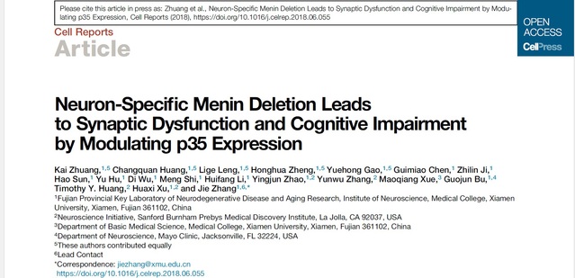 7月17日,国际著名杂志《Cell》子刊《Cell Reports》在线发表了厦门大学医学院神经科学研究所张杰教授团队的最新研究成果“Neuron-specific menin deletion leads to synaptic dysfunction and cognitive impairment by modulating p35 expression.”,揭示了神经发育与退行性疾病关键激酶CDK5的全新调控机理。厦门大学医学院博士生庄恺等为第一作者,张杰教授为该论文的通讯作者。