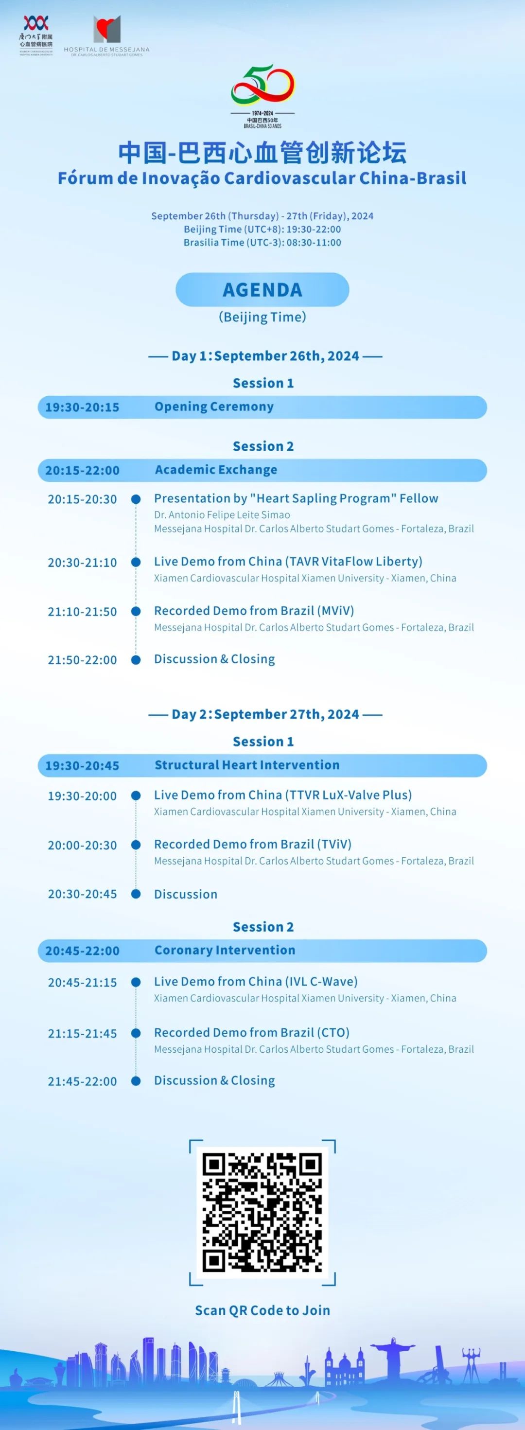 9月26-27日,由厦门大学附属心血管病医院(简称“厦心医院”)和巴西梅塞亚纳医院(Hospital de Messejana Dr. Carlos Alberto Studart Gomes)共同主办的中国-巴西心血管创新论坛以线上形式成功举办。本次论坛旨在庆祝中巴两国建交50周年,深化厦门与福塔莱萨国际友城关系,促进金砖国家医疗交流与合作。
