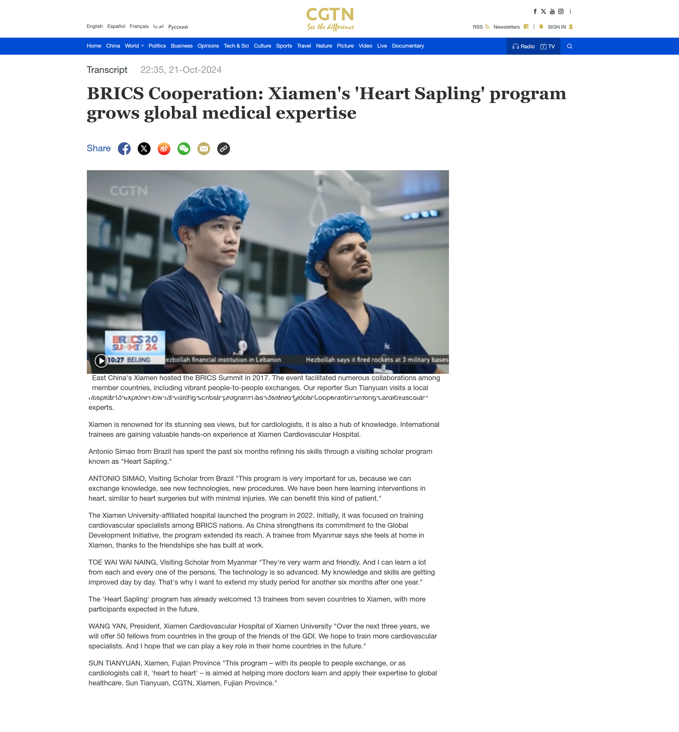 原文及视频链接:BRICS Cooperation: Xiamen's 'Heart Sapling' program grows global medical expertise - CGTN