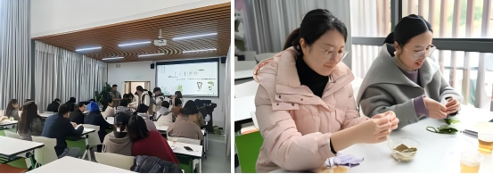 最后的香囊制作环节,安排在八闽苑会议室进行。药园教学助理向老师们详细介绍了中医传统香囊的常用药物搭配、制作工艺及其用途,并协助指导老师们配制和称量中药粉末。香囊的制作则由参加活动的老师们亲手完成,香囊外囊是专门为此次活动准备的定制款香囊。在制作过程中,大家相互讨论,热烈交流,共同体验了中医药传统文化的魅力。