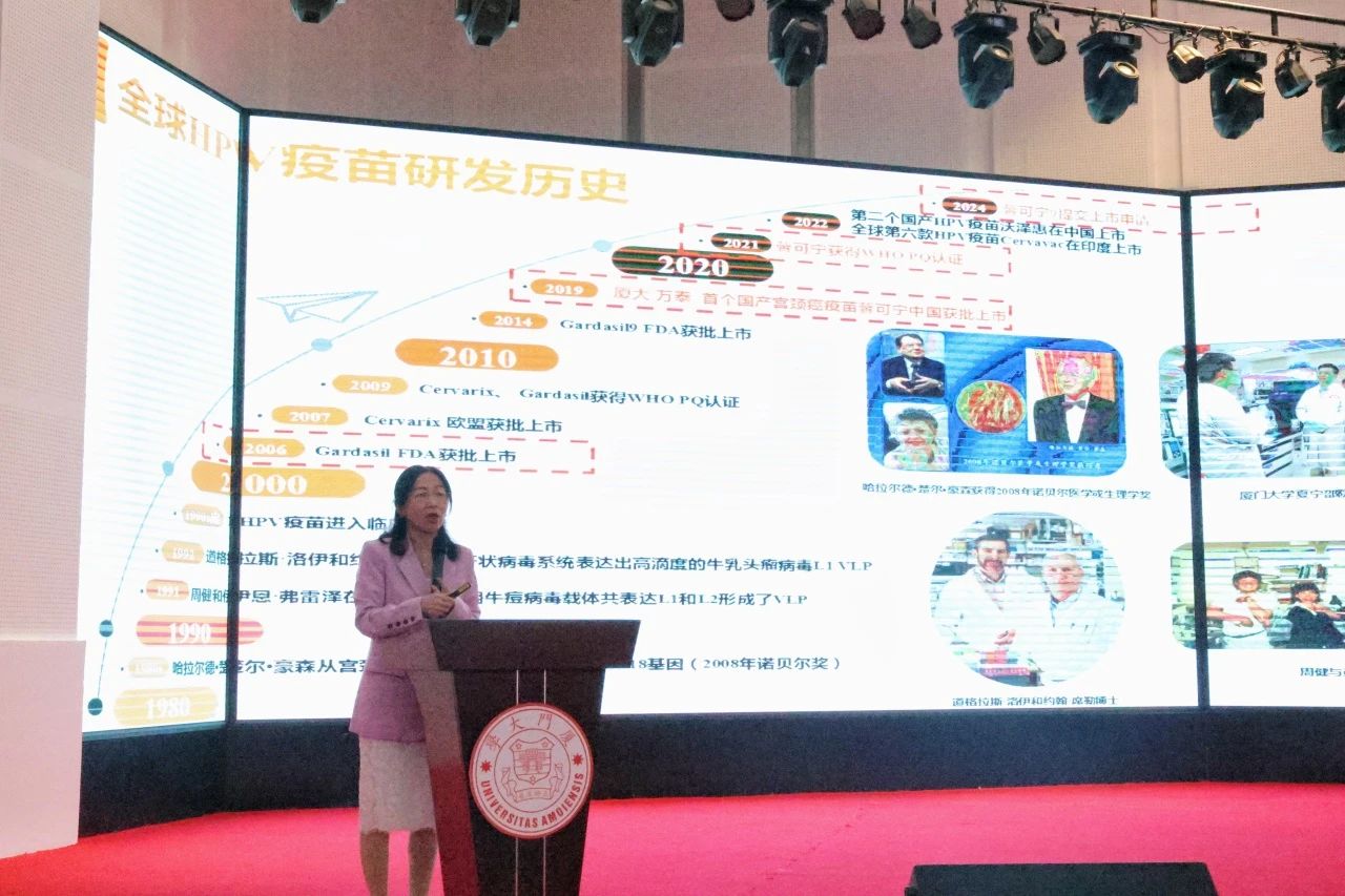 讲座上,吴婷以“走向世界的厦门HPV疫苗”为题,结合理论数据和临床实例,详细介绍了国产HPV疫苗的研发历程、作用原理、保护效果和临床应用,展示了HPV疫苗在全球预防HPV相关癌症中的关键作用。她指出,挽救生命的疫苗不应成为奢侈品,研发质优价廉的疫苗是未来科研的重要目标,并呼吁社会各界携手,为消除宫颈癌贡献力量。