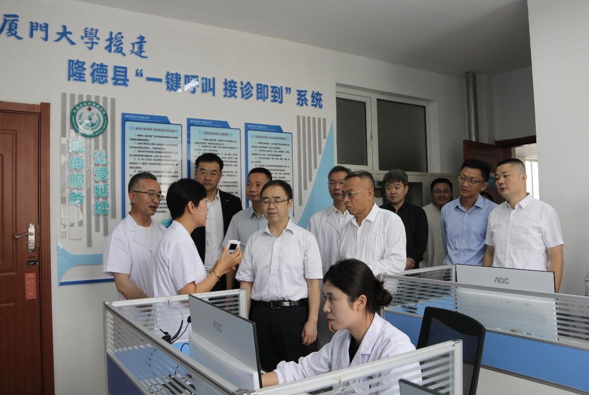 7月19日上午,李峰一行陪同张宗益校长赴隆德县人民医院考察由学校援建的医疗远程会诊平台和“一键呼叫、接诊即到”系统,与附属翔安医院专家团队线上连线交流。张宗益表示,开展医疗帮扶为推进乡村全面振兴提供了坚实健康保障,要坚持“隆德所需,厦大所能”,整合更多优势医疗资源,组建更多专业队伍,助力隆德医疗健康事业高质量发展。